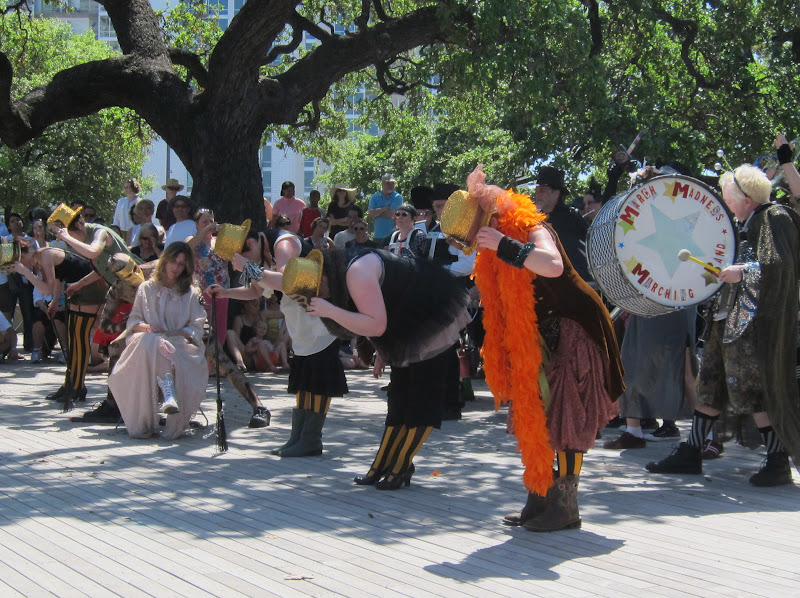 The first two days of HONK!TX took place up near the University of Texas, then the festival moved downtown for the final day. Bill and I watched the bands pass by on East Sixth Street. Minor Mishap Marching Band from Austin brought up the rear of the parade. (We became fans of this band.at last December’s Downtown Stroll,) Along with other bystanders, we followed the parade about six blocks over to Republic Square Park.